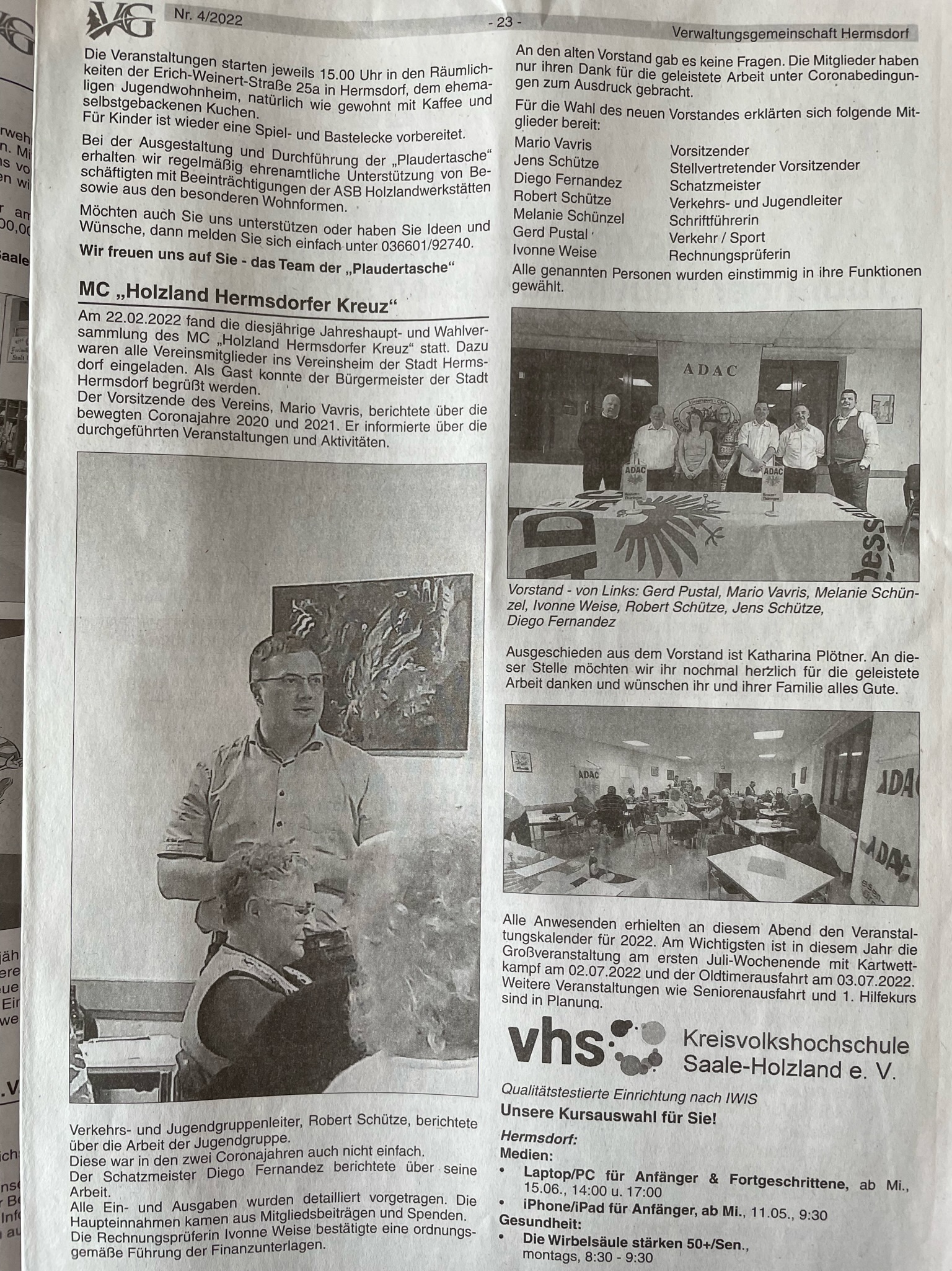 Am 21.02.2019 lud der MC Holzland Hermsdorfer Kreuz e.V. zur Jahreshaupt- und Wahlversammlung in das Vereinsheim der Stadt Hermsdorf ein. Vorstandsvorsitzender MarioVavris eröffnete die Versammlung vor den zahlreich erschienen Mitgliedern und begrüßte Gast Landrat Andreas Heller. Wahlleiter Dr. Christoph Ludwig stellte die Beschlussfähigkeit fest. Anschließend gab Mario Vavris einen Überblick über die zahlreichen Veranstaltungen, die der Verein im Jahr 2018 veranstaltet hatte. So gab es vom 29.01.2018 bis zum 23.03.2018 in der „Kleinen Galerie“ im Stadthaus eine Ausstellung zum 90-jährigem bestehen des Vereins. Es wurde im Mai der 43. und 44. Jugendkartslalom auf dem Rathausplatz mit ca 70 Startern absolviert und bei schönsten Sonntagswetter die 37. Internationale Oldtimerausfahrt durch das wunderschöne Holzland gefahren. Genau 6 mal wurde im Jahr 2018 der ADAC Funpark bei verschiedenen Events der Stadt Hermsdorf aufgebaut und auch so konnte Kindern und Jugendlichen der Kartsport wieder etwas näher gebracht werden. Es wurde ein Pannenkurs organisiert, der leider nicht sehr gut besucht wurde, dafür war die Verkehrsteilnehmerschulung der Fahrschule Martin ein voller Erfolg gewesen.